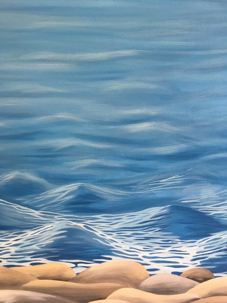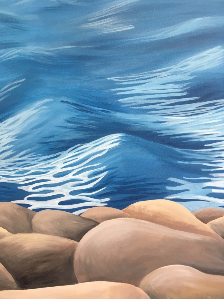 When painting the water I wanted to create the illusion that the water just below the mountains was much further away than the water lower down in the mural, just above the rocks. When looking at the sea you will notice that you see waves breaking close to the shore, but the water looks calm in the distance. This is how I painted the sea in my mural. I add some definition of the waves just above the rocks and gradually faded this out towards the mountains.